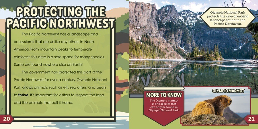 The almost 1 million acres of Olympic National Park protect hundreds of lakes, thousands of miles of rivers and streams, as well as 75 miles of the Pacific coast. It includes many different ecosystems within its borders too, from glaciers to temperate forests. Readers journey through all of these incredible parts of the park in the pages of this book, complete with beautiful full-color photographs. Fact boxes add even more information to aid knowledge building, a key component of the science of reading.